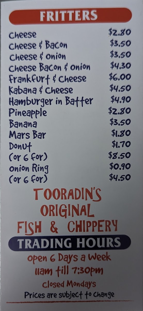 While prices may be slightly higher than typical chip shops, many argue that the exceptional service and quality justifies the cost. Beyond the crispy chips, there's a unique flair with offerings such as the fried Mars bar, a sweet ending to your meal. Whether you're a fan of the classics or eager to try something new, Tooradin's menu promises a satisfying experience worth returning for.